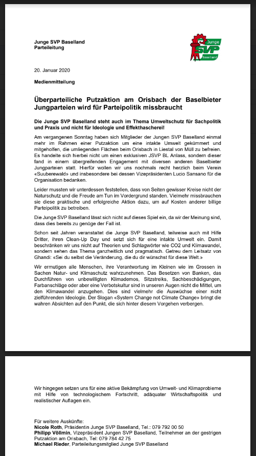 Überparteiliche Putzaktion am Orisbach der Baselbieter Jungparteien wird für Parteipolitik missbraucht
